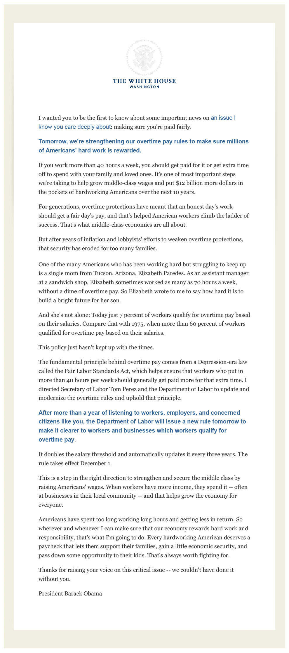 President Obama had signed a Presidential Memorandum directing the Department of Labor to update the rules defining and delimiting the exemptions under the FLSA in 2014. A comment period was open from July 2015 to September 2015 and the Department of Labor received over 270,000 comments and feedback used to shape the Final Rule.